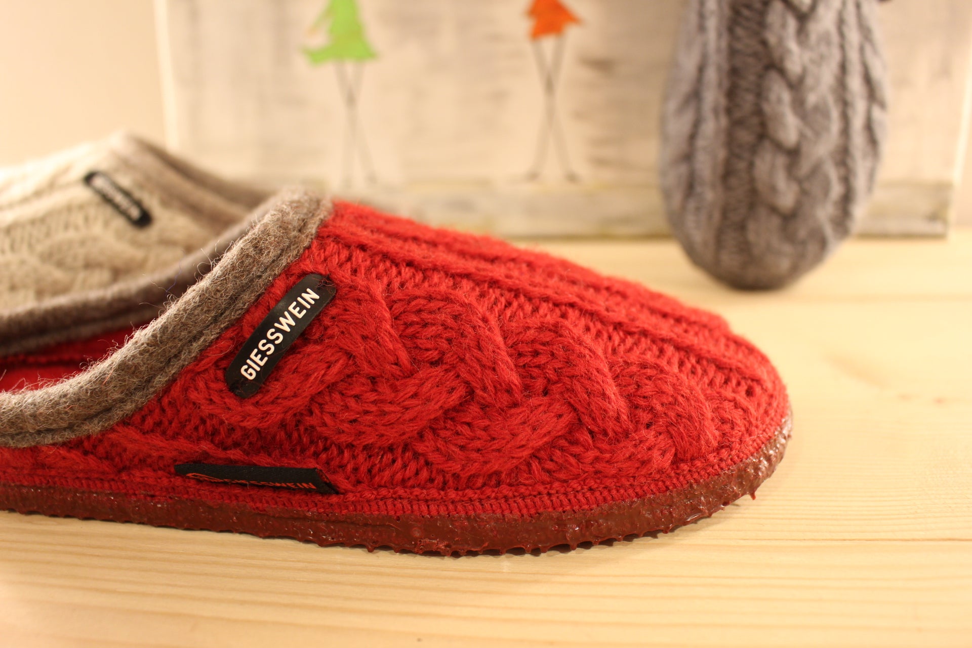 Chaussons GIESSWEIN - 42471. Fabrication Autrichienne. Chausson coupe mule en laine torsadée de couleur rouge, grise ou agneau (crème). Bordure en laine. Couture complète sur le tour de la semelle pour un bon maintien. Chausson Extra souple. Semelle interne en laine ton sur ton. Semelle externe crantée en gomme extra légère. Anti-dérapante. Chausson extra souple et lavable en machine à 30°.