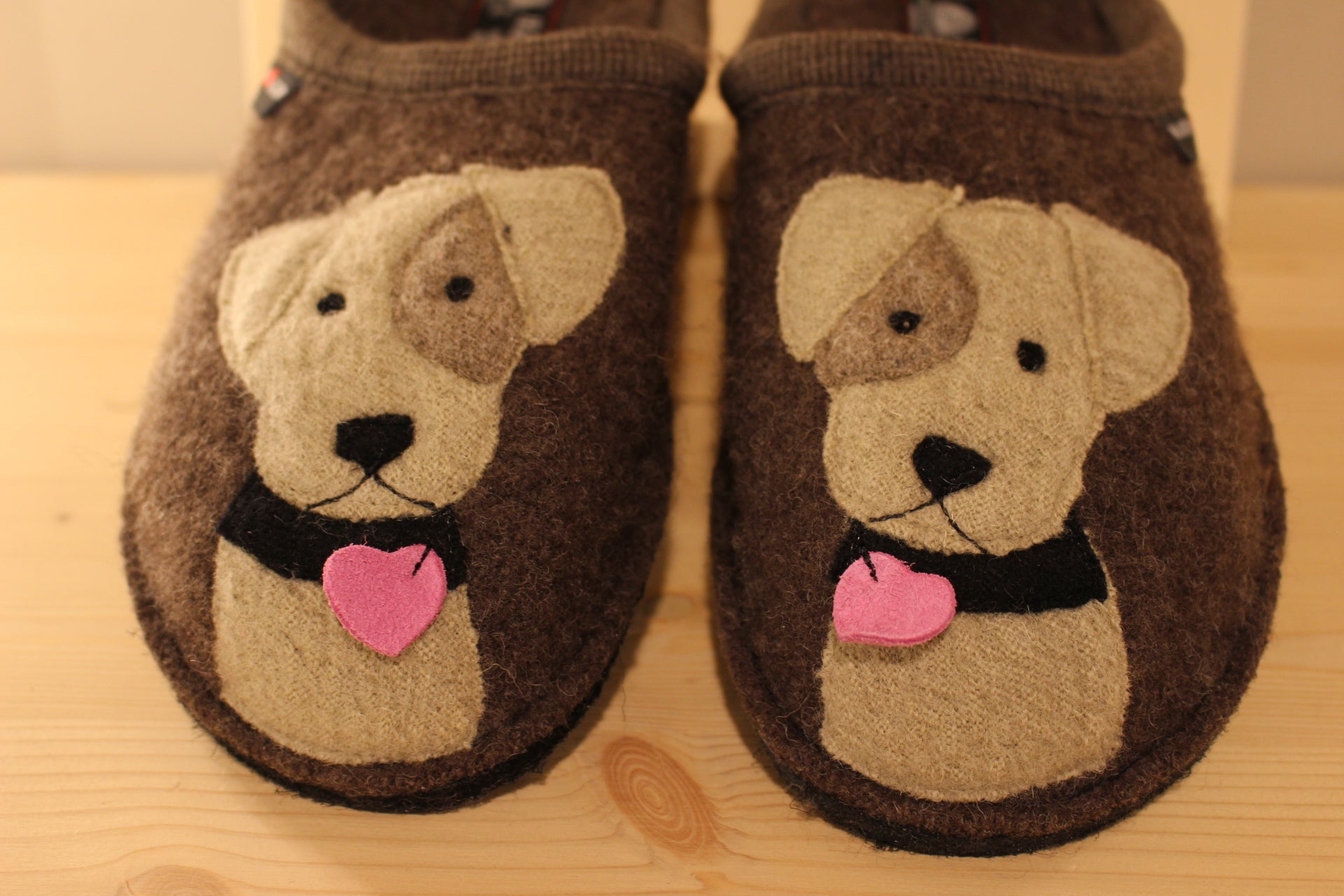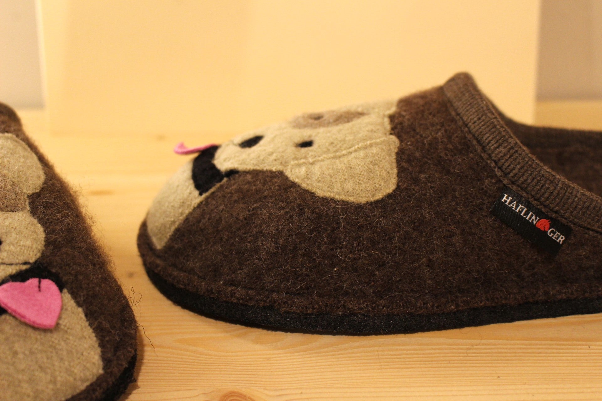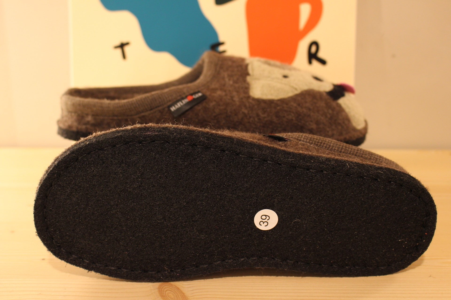 Chaussons HAFLINGER Flair Rudy. Marque allemande. Chaussons coupe mule en pure laine de couleur chocolat avec le dessin d'un chien au niveau du coup de pied. Chausson cousu. Chausson Extra souple. Semelle interne en pur laine avec maintien de la voûte plantaire. Semelle externe en feutre (mélange gomme) anti-dérapant. Comment ne pas craquer pour l'air mignon de Rudy le toutou :)