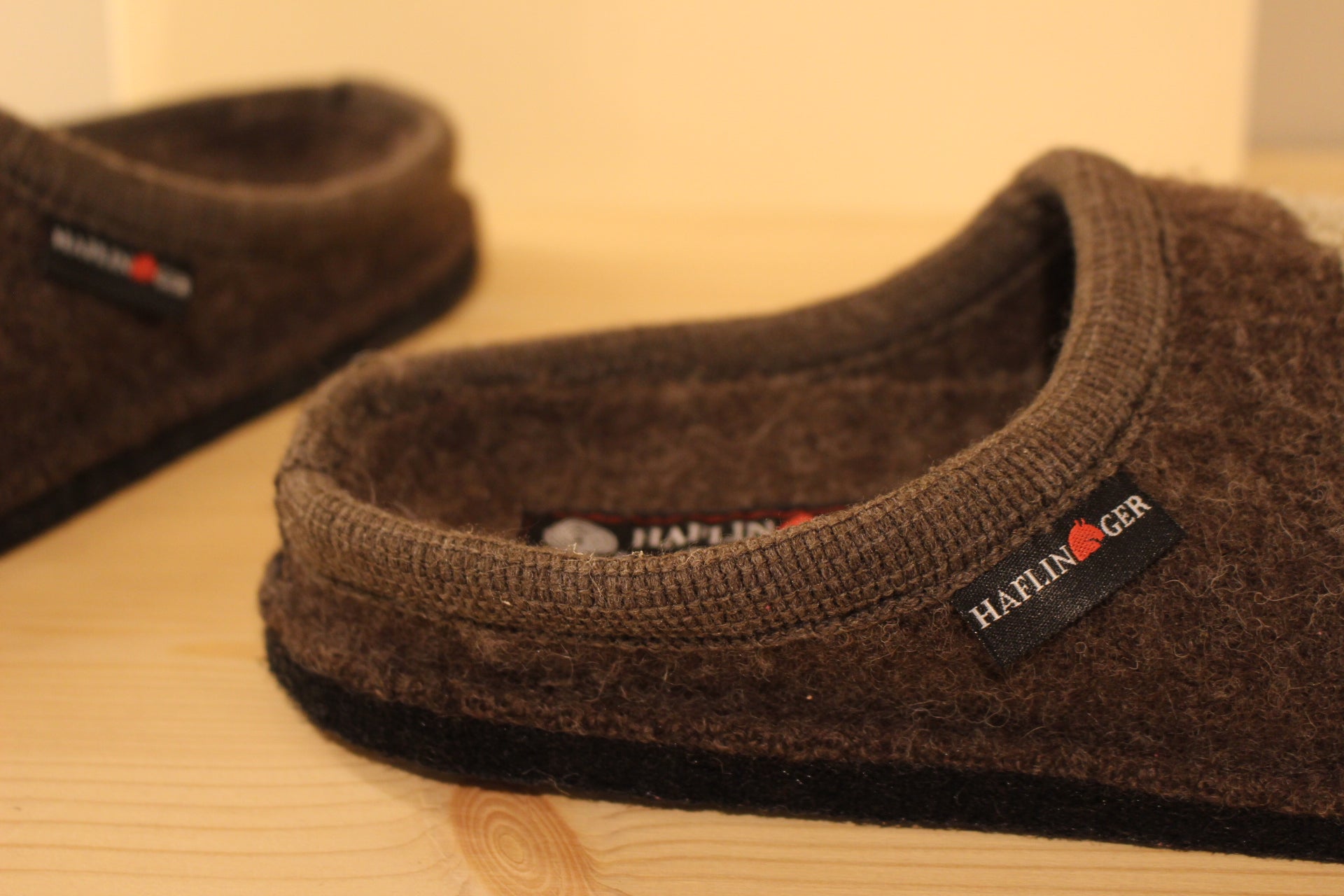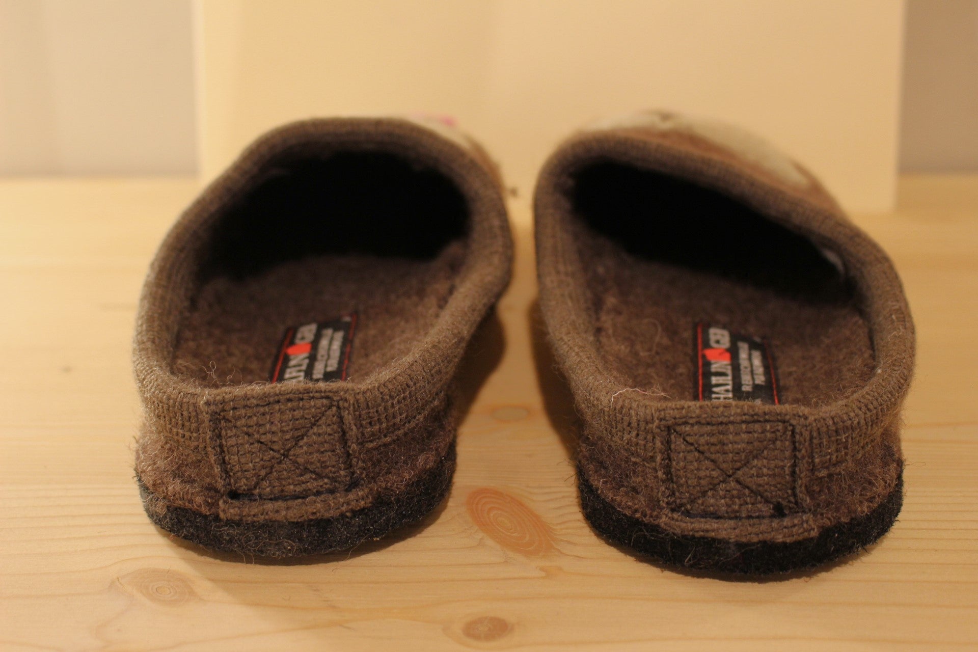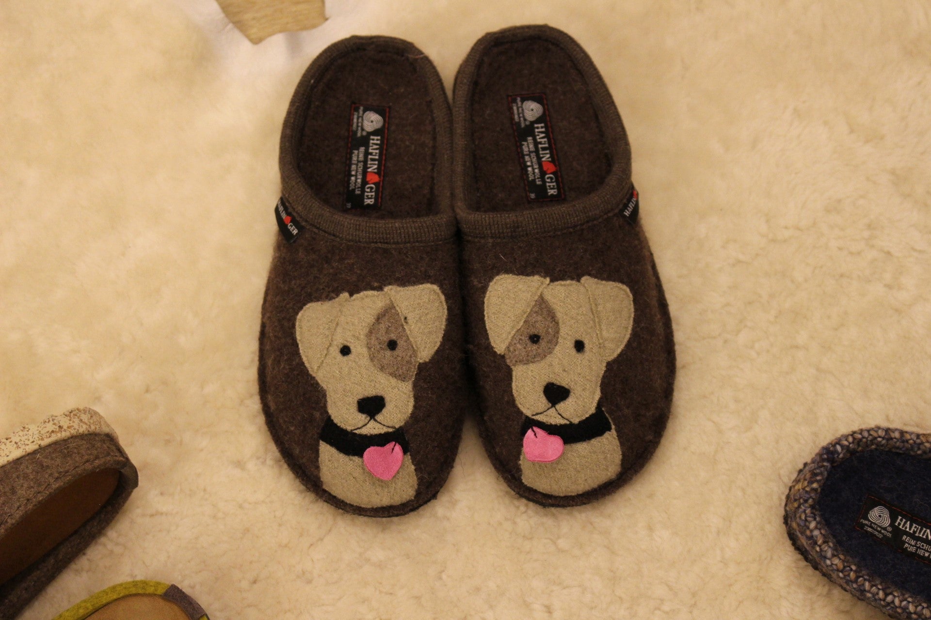 Chaussons HAFLINGER Flair Rudy. Marque allemande. Chaussons coupe mule en pure laine de couleur chocolat avec le dessin d'un chien au niveau du coup de pied. Chausson cousu. Chausson Extra souple. Semelle interne en pur laine avec maintien de la voûte plantaire. Semelle externe en feutre (mélange gomme) anti-dérapant. Comment ne pas craquer pour l'air mignon de Rudy le toutou :)