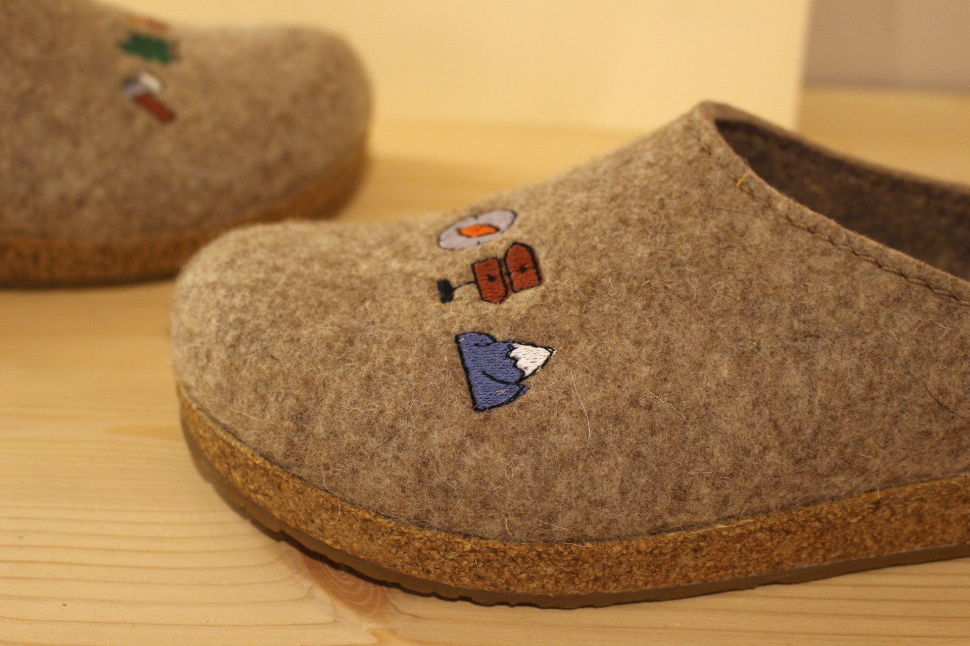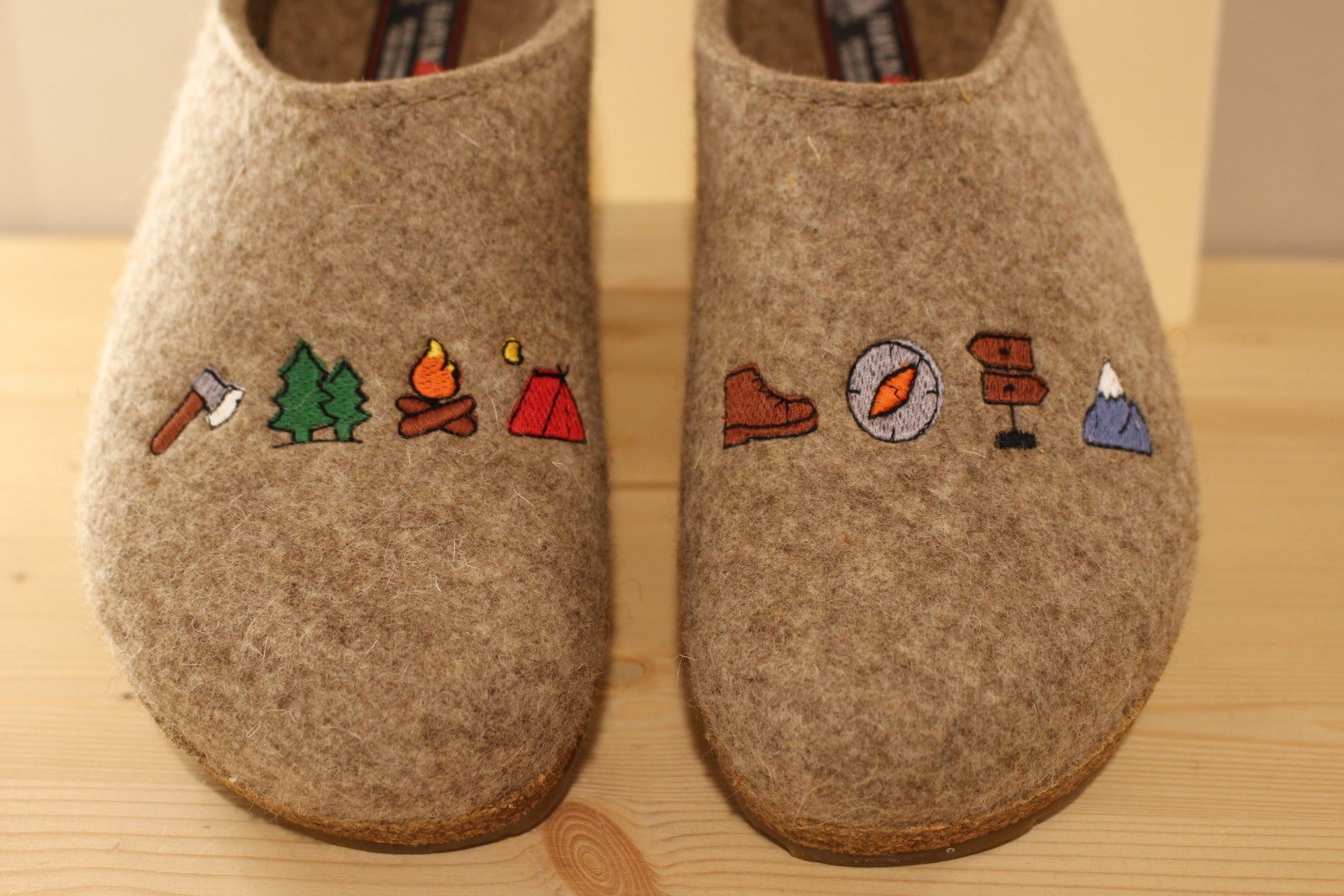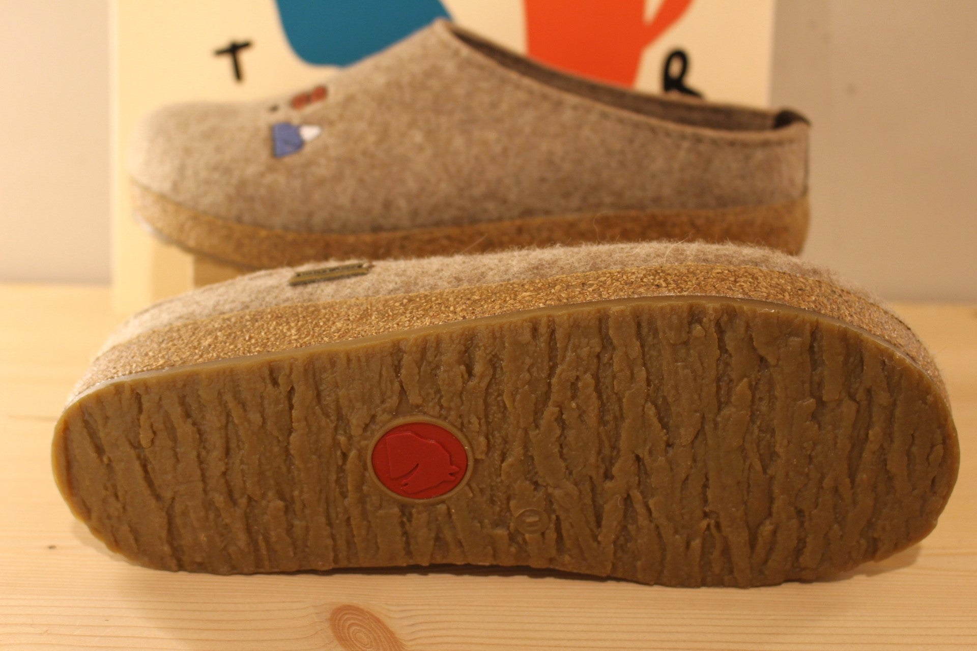 Chaussons HAFLINGER Grizzly Wanderlust. Marque allemande. Chaussons coupe sabot en pur laine de couleur taupe. Décoration brodée de motifs évoquant la montagne et la randonnée. Retour à l'arrière assez montant pour permettre un meilleur maintien à la marche. Semelle interne en laine avec maintien de la voûte plantaire. Bloc externe montée en liège caoutchouté. Semelle externe en gomme anti-dérapante. On peut aussi marcher en extérieur !!! Il y a du répondant. Prenez une pointure de moins le chaussant est généreux.