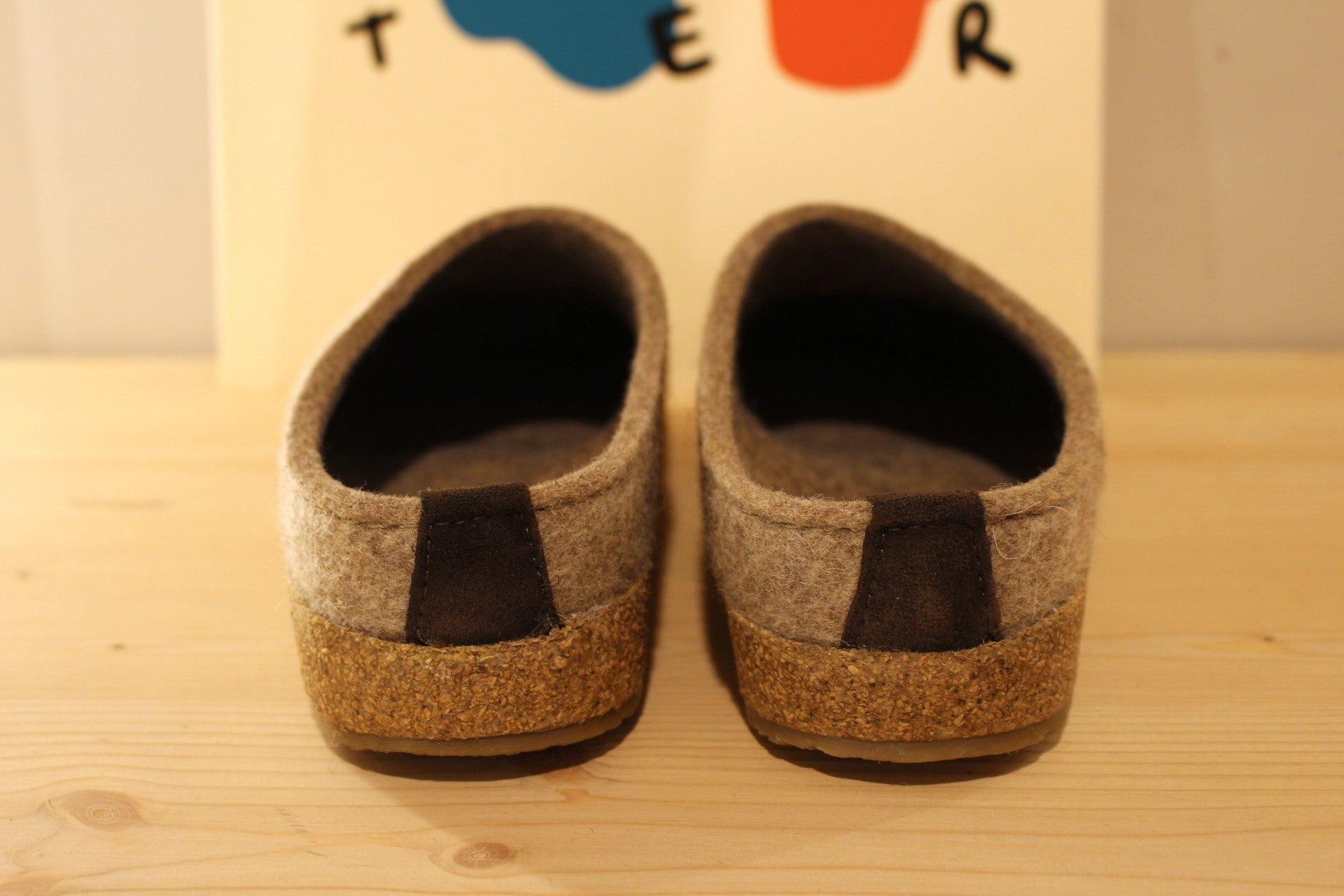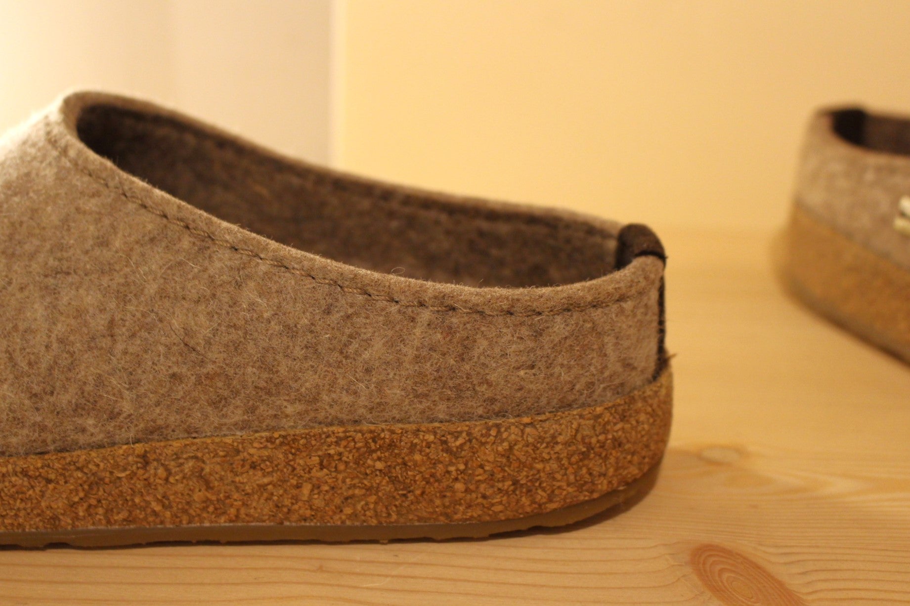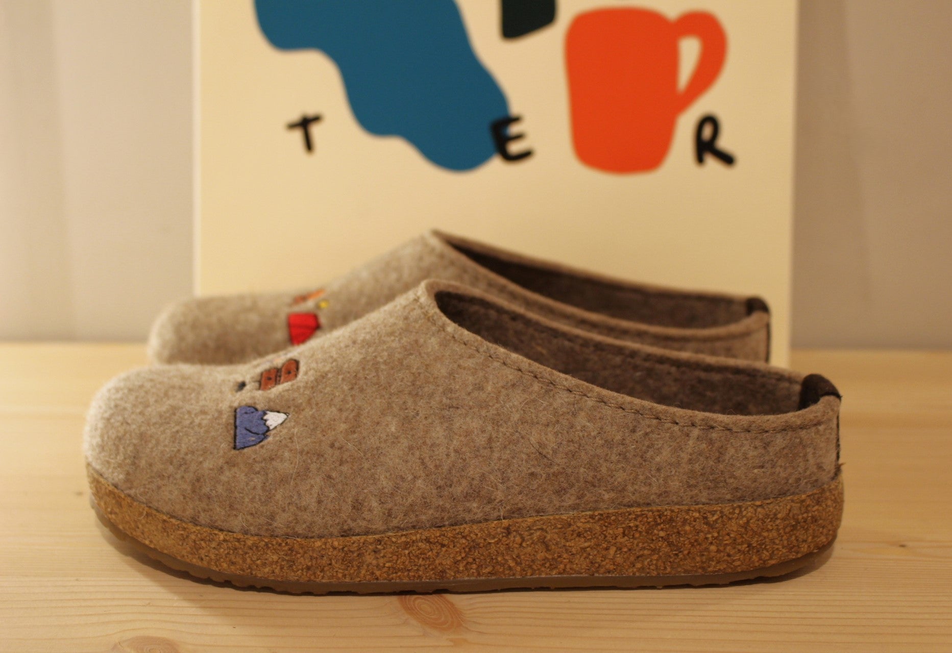 Chaussons HAFLINGER Grizzly Wanderlust. Marque allemande. Chaussons coupe sabot en pur laine de couleur taupe. Décoration brodée de motifs évoquant la montagne et la randonnée. Retour à l'arrière assez montant pour permettre un meilleur maintien à la marche. Semelle interne en laine avec maintien de la voûte plantaire. Bloc externe montée en liège caoutchouté. Semelle externe en gomme anti-dérapante. On peut aussi marcher en extérieur !!! Il y a du répondant. Prenez une pointure de moins le chaussant est généreux.